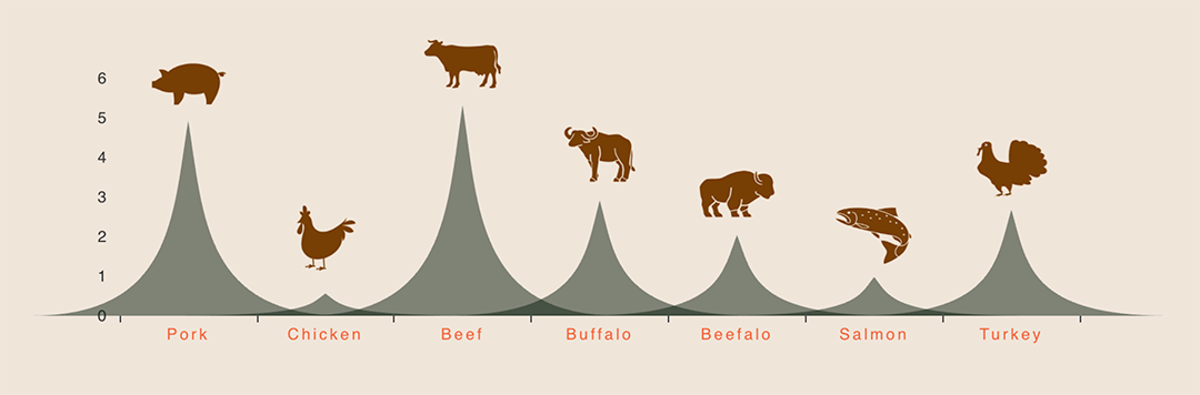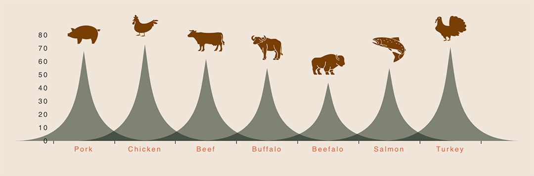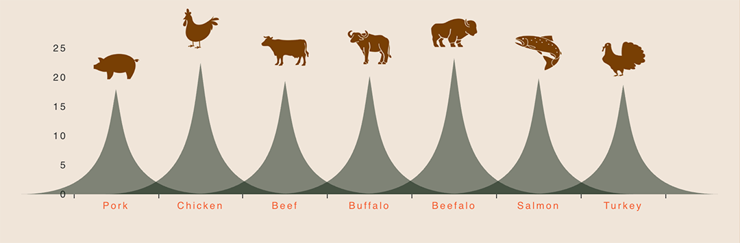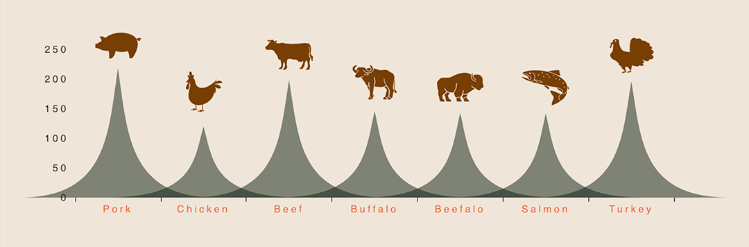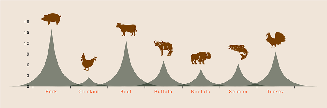 Pork (84% lean), ground | Chicken Skinless Breast boneless | Grass Fed Beef, ground | Buffalo, ground | Salmon, wild Atlantic | Turkey, ground